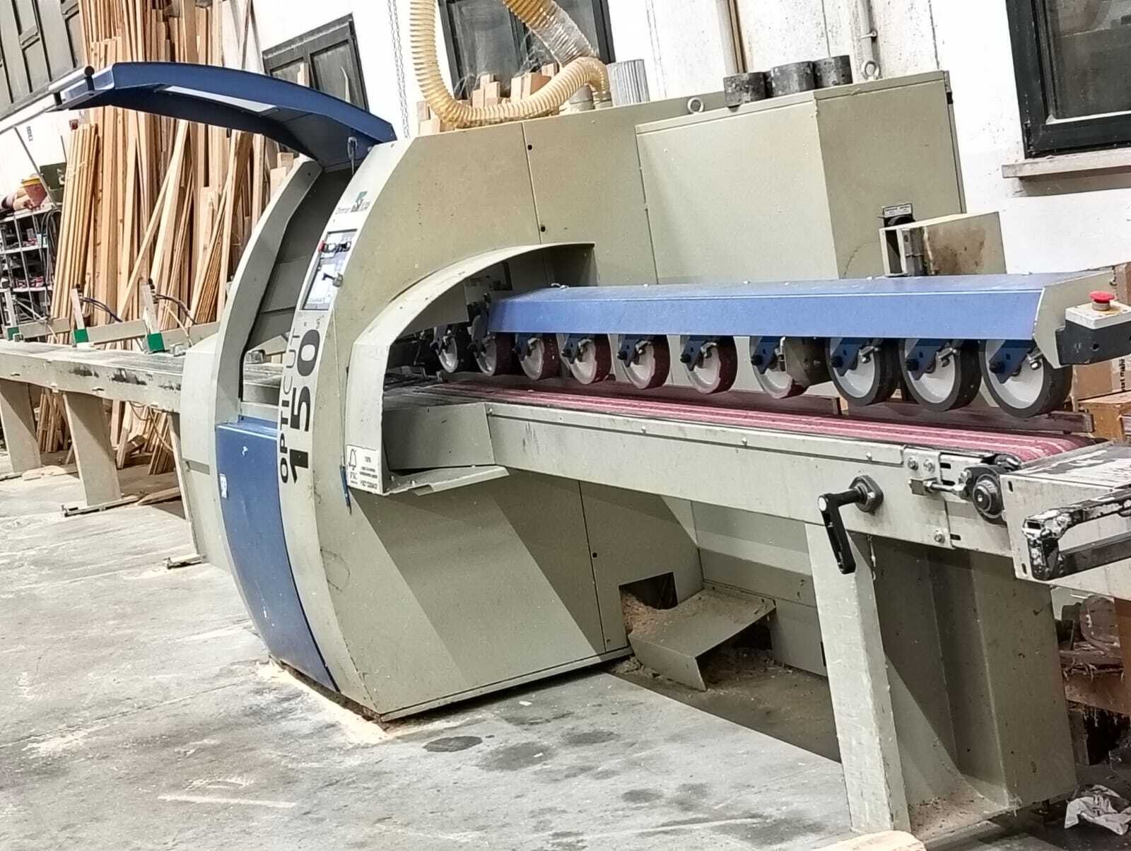 TRONCATRICE USATA WEINIG OPTICUT 150 ANNO 2002 - Diametro la a 500 mm – Foro lama 30 mm - Lunghezza in entrata 500 mm - Larghezza legno 30 – 300 mm - Spessore legno 12 – 80 mm - Sezione legno (generalmente rettangolare) 220 x 80 mm / 290 x 25 mm - Tolleranza dello spessore +/- 3 mm - Velocità di avanzamento max. 150 m/min. - Potenza motore lama 5,5 KW - Potenza motore avanzamento 3 KW - Stazione introduzione e marcatura: lunghezza 5 m per max lunghezza entrata 6,3 m - Introduzione della sega con nastro ca. 2500 mm - Nastro trasportatore in uscita 10 m con 4 espulsori